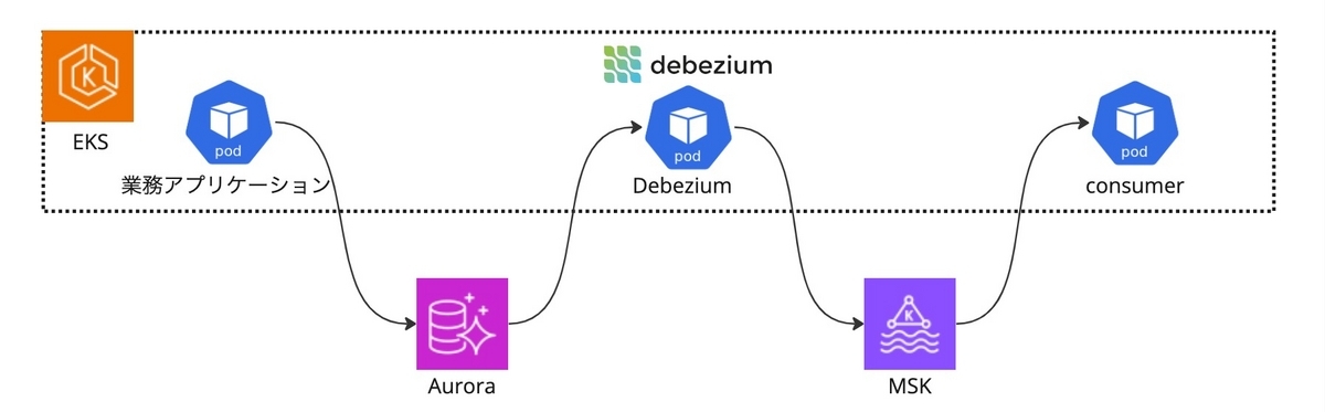 Debezium は EKS 上の Pod で動かしており、データベースには Aurora PostgreSQL を利用しています。