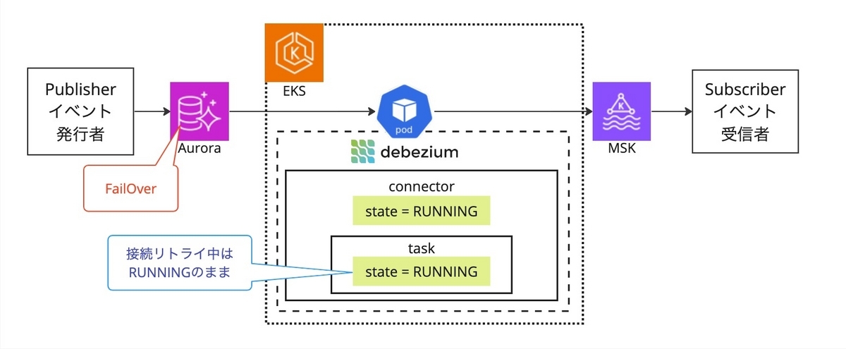 Aurora は FailOver 時にも素早く復旧してくれます。とはいえ、クライアントからすると一度接続が切れることには変わりありません。Debezium には接続が切れた際にリトライする機構が備わっており、再接続できた場合は処理を再開します。(v1.9あたりでリトライ周りの実装をいろいろと改善して頂いたみたいです。)
