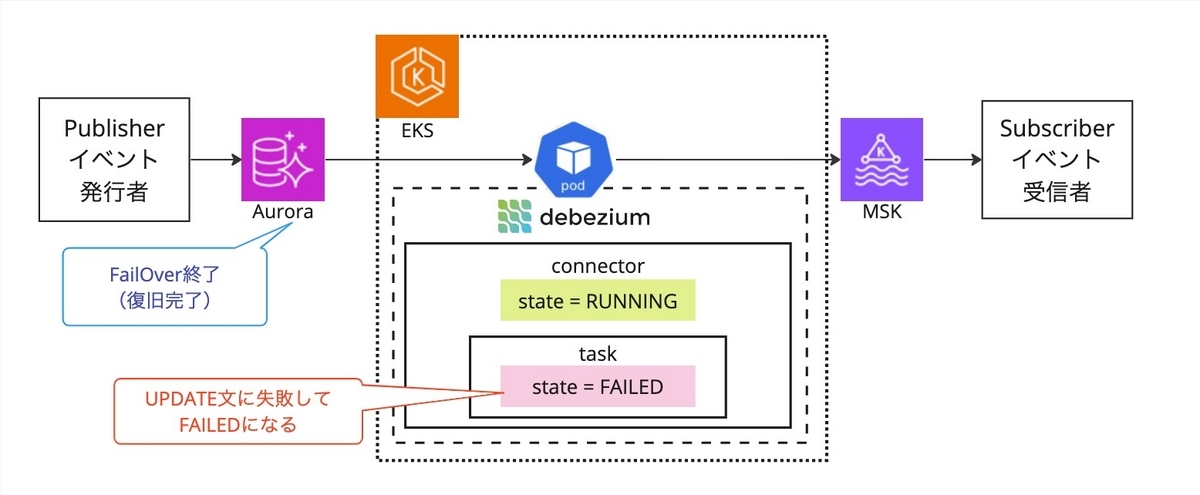 - Debezium の FailOver 対策としては、EKS の livenessProbe で tasks の state が FAILED になっていないかどうかを監視する。